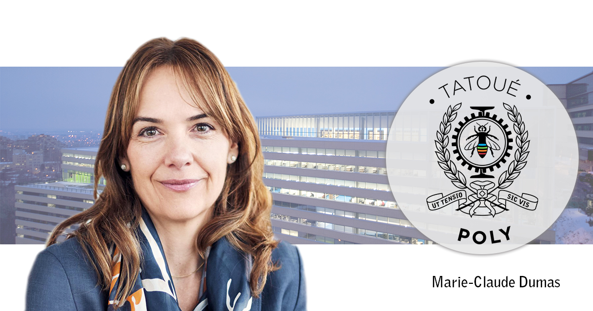 Aujourd’hui, c’est au tour de la Fondation et Alumni de Polytechnique Montréal de souligner fièrement les réalisations de Marie-Claude Dumas qui font rayonner Polytechnique Montréal et de lui remettre le titre de Tatouée Poly en reconnaissance de son dévouement et de sa contribution au développement de l’institution.