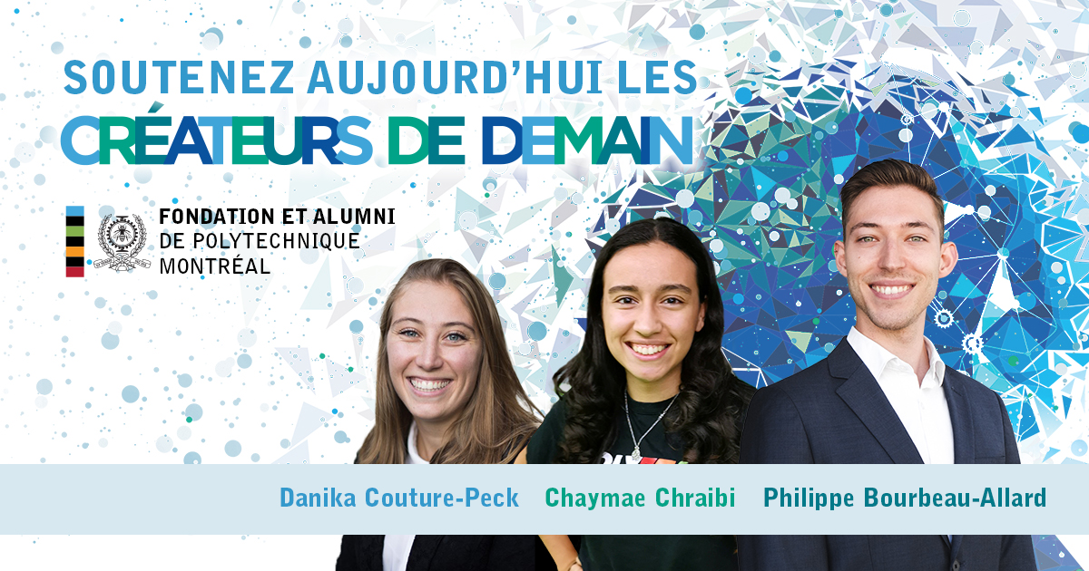 Nous pouvons être fiers d’avoir de si beaux parcours au sein de notre relève. Jonathan, Danika, Philippe et Chaymae font preuve d’une incroyable détermination et d’un indéniable talent leur permettant de prendre part à une vie étudiante foisonnante avec de grands projets, tout en gardant le cap sur des études exigeantes en génie à Polytechnique Montréal. Aujourd’hui et au nom de tous les jeunes diplômés et étudiants de Polytechnique Montréal, ils sont reconnaissants pour le soutien que vous leur apportez. Grâce à vos dons, leurs rêves, leurs valeurs et leurs idées se concrétisent.