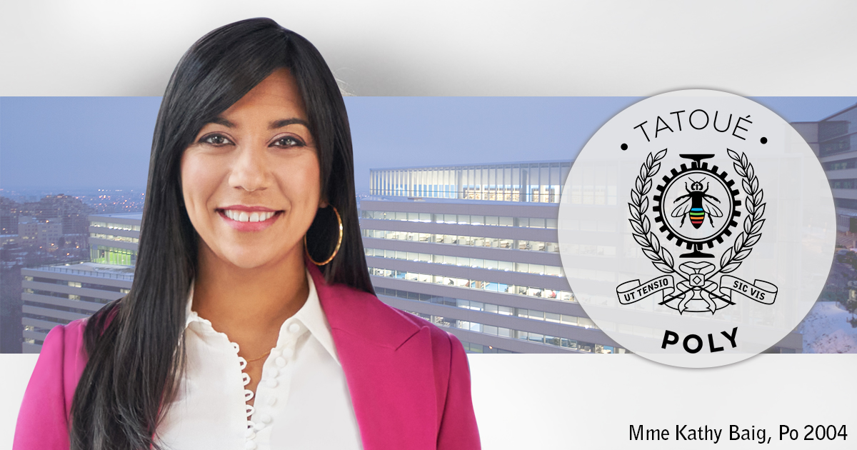 Cette année, pour la première fois de son histoire, Polytechnique Montréal a diplômé 30,2 % de femmes au baccalauréat. Suite à cette belle nouvelle qui est le fruit de nombreux efforts au sein de la communauté polytechnicienne, il nous tient à cœur de présenter une femme au parcours exceptionnel dans le cadre de notre campagne Tatoué Poly. Une campagne qui nous permet de célébrer les membres de la communauté polytechnicienne, ainsi que leur dévouement et leur sentiment d’appartenance envers leur alma mater. Mme Kathy Baig, Po 2004, représente une inspiration pour les jeunes femmes qui poursuivent leurs études en génie. Tout au long de sa carrière, elle a témoigné d’une passion et d’un engagement débordants pour soutenir le génie, et notamment le génie au féminin.