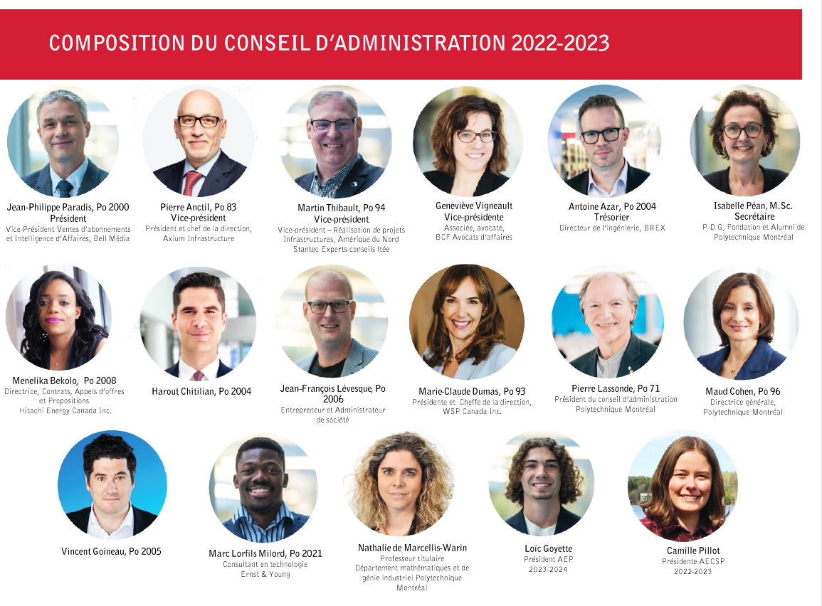 Nous remercions toutes nos administratrices et tous nos administrateurs bénévoles pour leur fidélité et leur engagement auprès de la Fondation et Alumni de Polytechnique Montréal. Ils ont grandement contribué aux excellents résultats présentés dans notre rapport annuel 2022-2023.